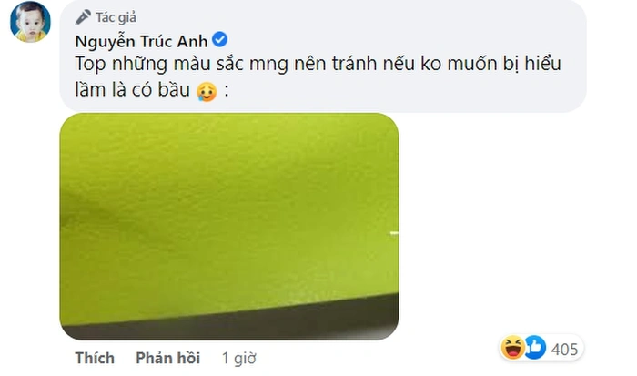 Ngoài ra, cô nàng cũng mạnh dạn nhắc nhở các bạn gái nên tránh mặc màu xanh chuối để khỏi bị tưởng lầm là đang mang bầu.