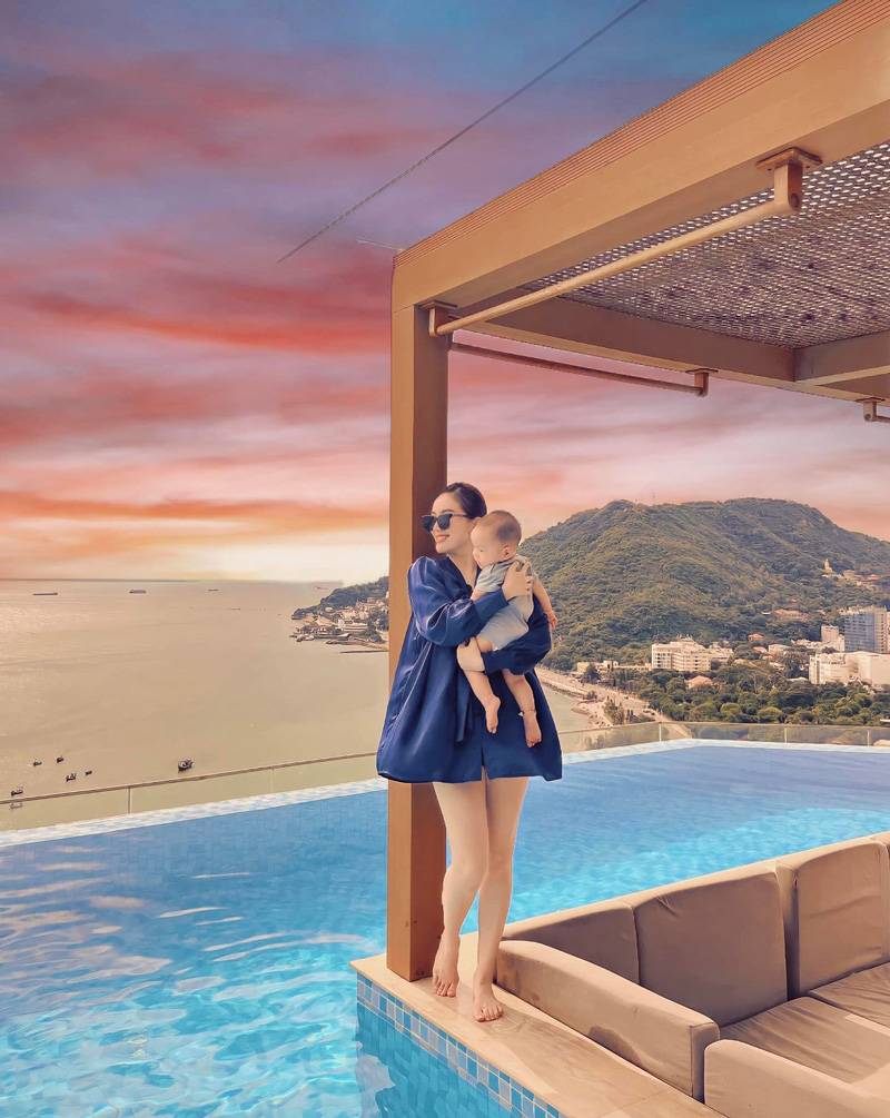 Nữ ca sĩ Công chúa bong bóng là một trong số ít những mỹ nhân showbiz Việt kể cả khi có mang và sau khi hạ sinh vẫn giữ được thân hình nóng bỏng, quyến rũ. Suốt quãng thời gian mang bầu, gần như nữ ca sĩ không như không để lộ bụng bầu. Phải tới khi kỷ niệm hai năm ngày cưới, cô mới khiến tất cả choáng váng khi công khai quý tử. Sau đó, thỉnh thoáng cô nàng lại đăng ảnh đi chơi cùng "đại ca nhí" và lần nào cũng khiến cho nhiều người phải phấn khích vì mẹ bỉm thì quá ư sexy, còn thái tử thì đáng yêu không để đâu cho hết.