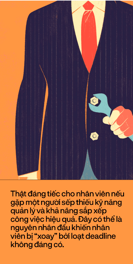 Thật đáng tiếc cho nhân viên nếu gặp một người sếp thiếu kỹ năng quản lý và khả năng sắp xếp công việc khoa học. Đây có thể là nguyên nhân đầu khiến nhân viên bị “xoay” bởi loạt deadline không đáng có. Bên cạnh đó, nhiều sếp thì “bội thu” sáng kiến, trong đầu luôn dạt dào những cải tiến và ý tưởng đổi mới sáng tạo không ngừng nhưng lại không sắp xếp được thứ tự ưu tiên và không có kế hoạch triển khai tuần tự, hợp lý, dễ khiến nhân viên chạy bở hơi tai cũng không theo kịp. Thậm chí, có sếp bị "workaholic" (nghiện công việc) quá đà hoặc đôi khi do cuộc sống cá nhân không có nhiều thú vui nên làm việc triền miên bất kể ngày nghỉ và cuối tuần, từ đó đòi hỏi nhân viên cũng phải làm tương tự.