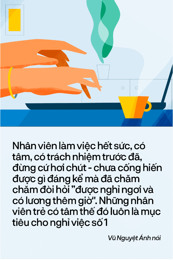 Chị Nguyệt Ánh cho hay: “Nhân viên làm việc hết sức, có tâm, có trách nhiệm trước đã, đừng cứ hơi chút - chưa cống hiến được gì đáng kể mà đã chăm chăm đòi hỏi được nghỉ ngơi và có lương thêm giờ. Những nhân viên trẻ có tâm thế đó luôn là mục tiêu cho nghỉ việc số 1 của các nhà quản lý, lãnh đạo.