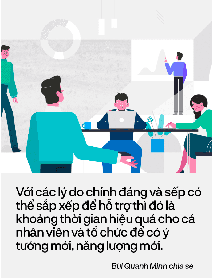 Đôi khi sếp cũng không ngại tạo điều kiện tối đa cho nhân viên có cơ hội nghỉ dài. Anh Quang Minh là ví dụ: “Với những nhân sự mà mình xác định hợp tác lâu dài thì ở tổ chức của mình, thậm chí có nhân sự xin nghỉ những khoảng thời gian rất dài 3 - 6 tháng. Với các lý do chính đáng và sếp có thể sắp xếp để hỗ trợ thì đó là khoảng thời gian hiệu quả cho cả nhân viên và tổ chức để có ý tưởng mới, năng lượng mới. Miễn là hai bên hiểu rõ cái khoảng thời gian đó dành ra để làm gì và vẫn xác định tiếp tục gắn kết với nhau”.
