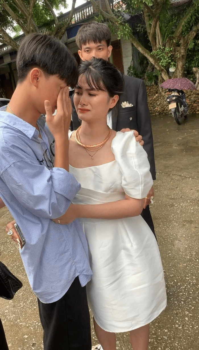 Khi đoàn nhà gái chuẩn bị lên xe ra về, cậu em trai không muốn xa chị nên đã chạy đến ôm chặt cô dâu, òa khóc nức nở.