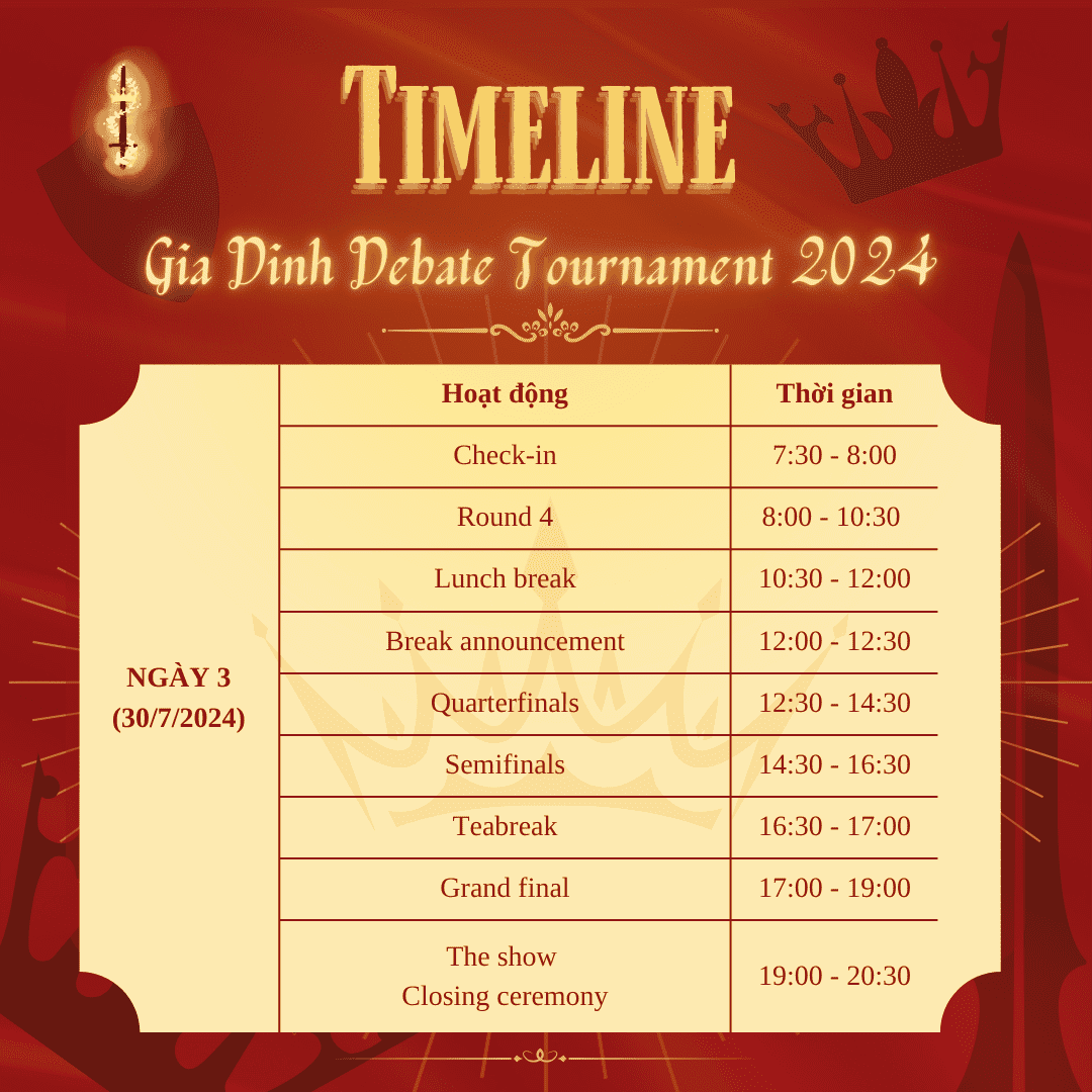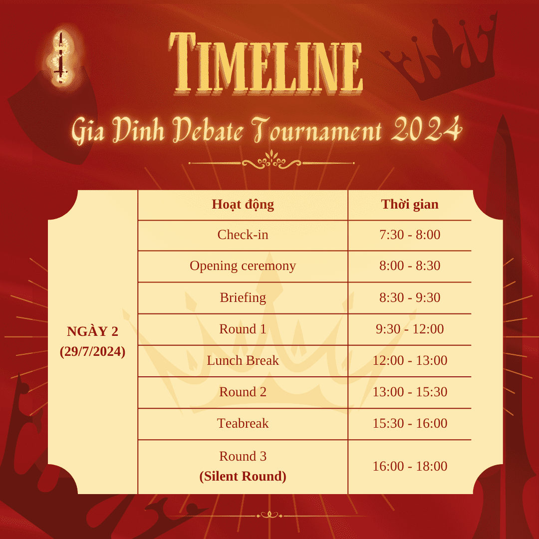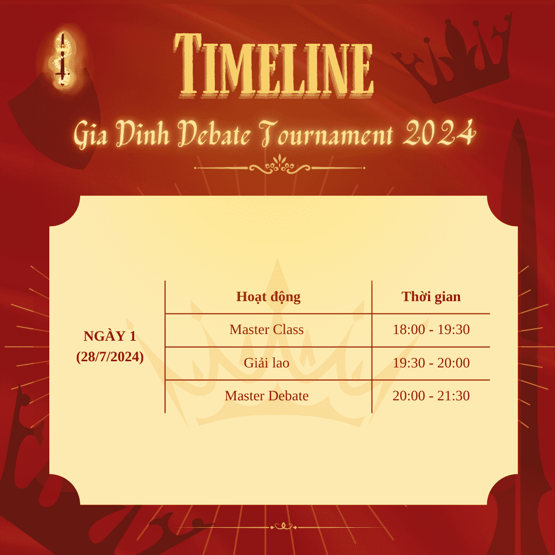 Nhanh chân lên hỡi những “quốc vương” tương lai! Lịch trình của giải đấu Gia Đình Debate Tournament 2024 cũng đã được công bố, đừng để đường xa cản trở chúng ta đến với cuộc chiến mà ta đã chờ đợi bấy lâu.