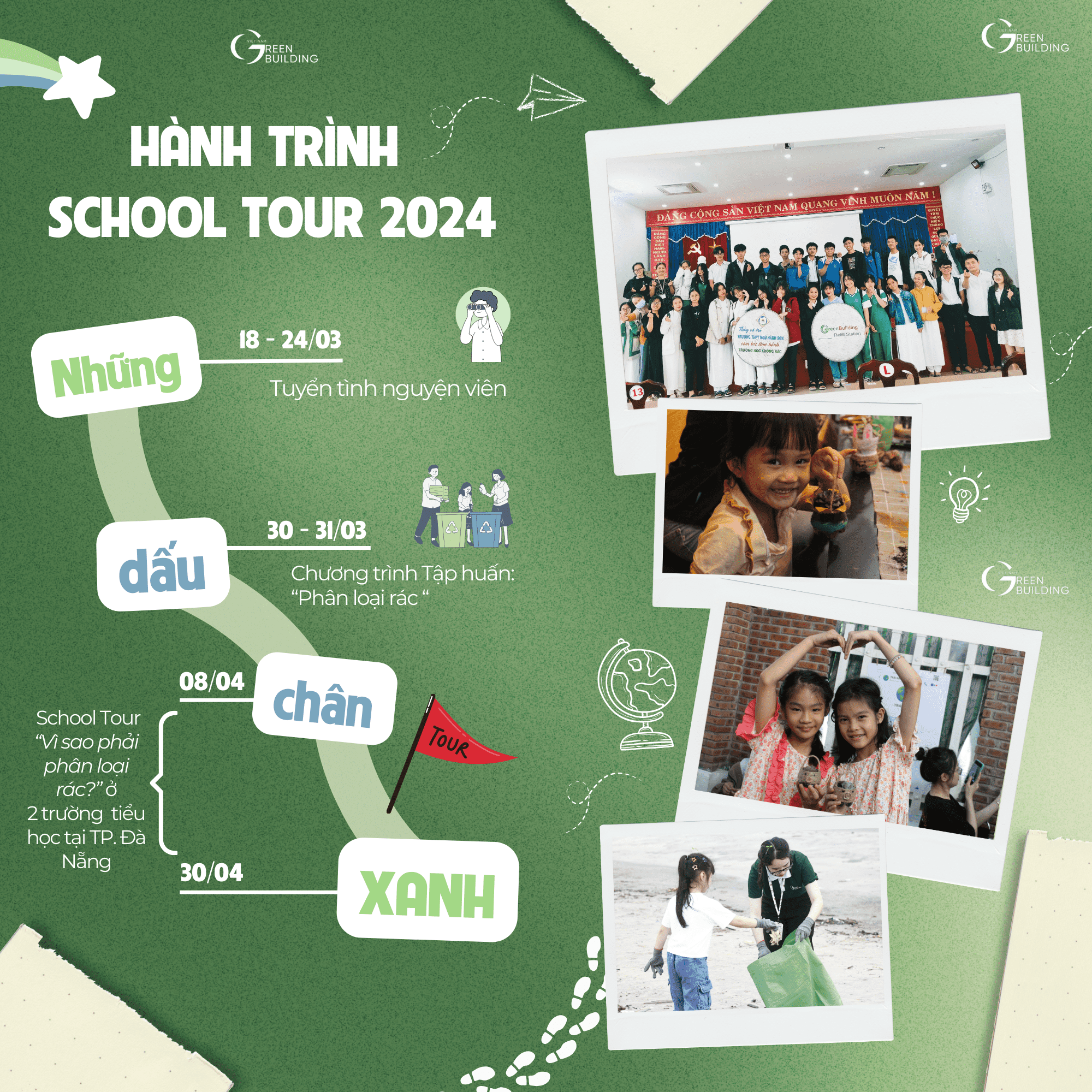 School Tour Những dấu chân Xanh 2024 là một trong những chiến dịch lớn mà Green Building tổ chức nhằm hướng tới các bạn học sinh về bảo vệ môi trường. Qua đó, góp phần tăng cường nhận thức, thực hành về phân loại rác thải và xây dựng hệ thống phân loại và xử lý rác tại trường.