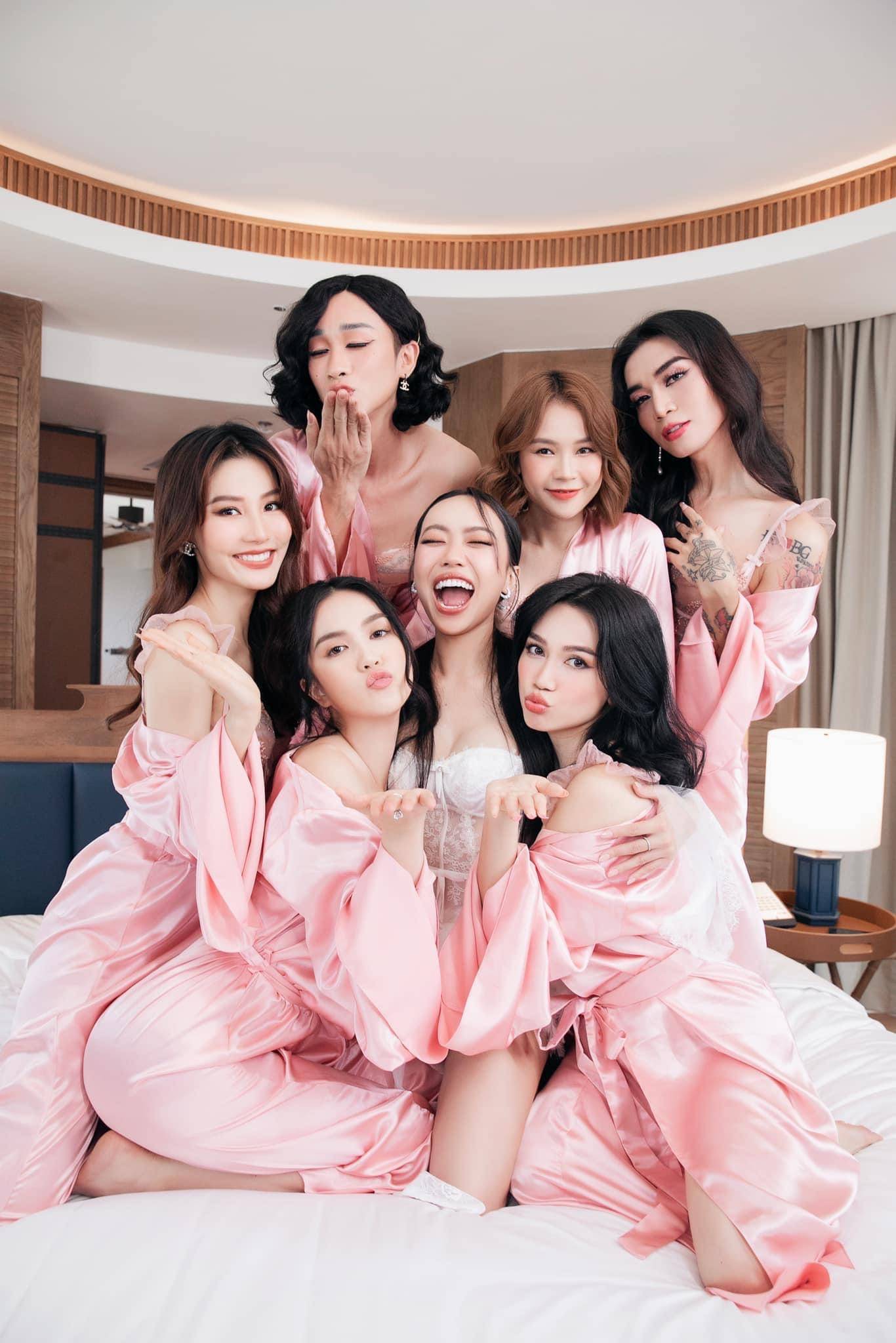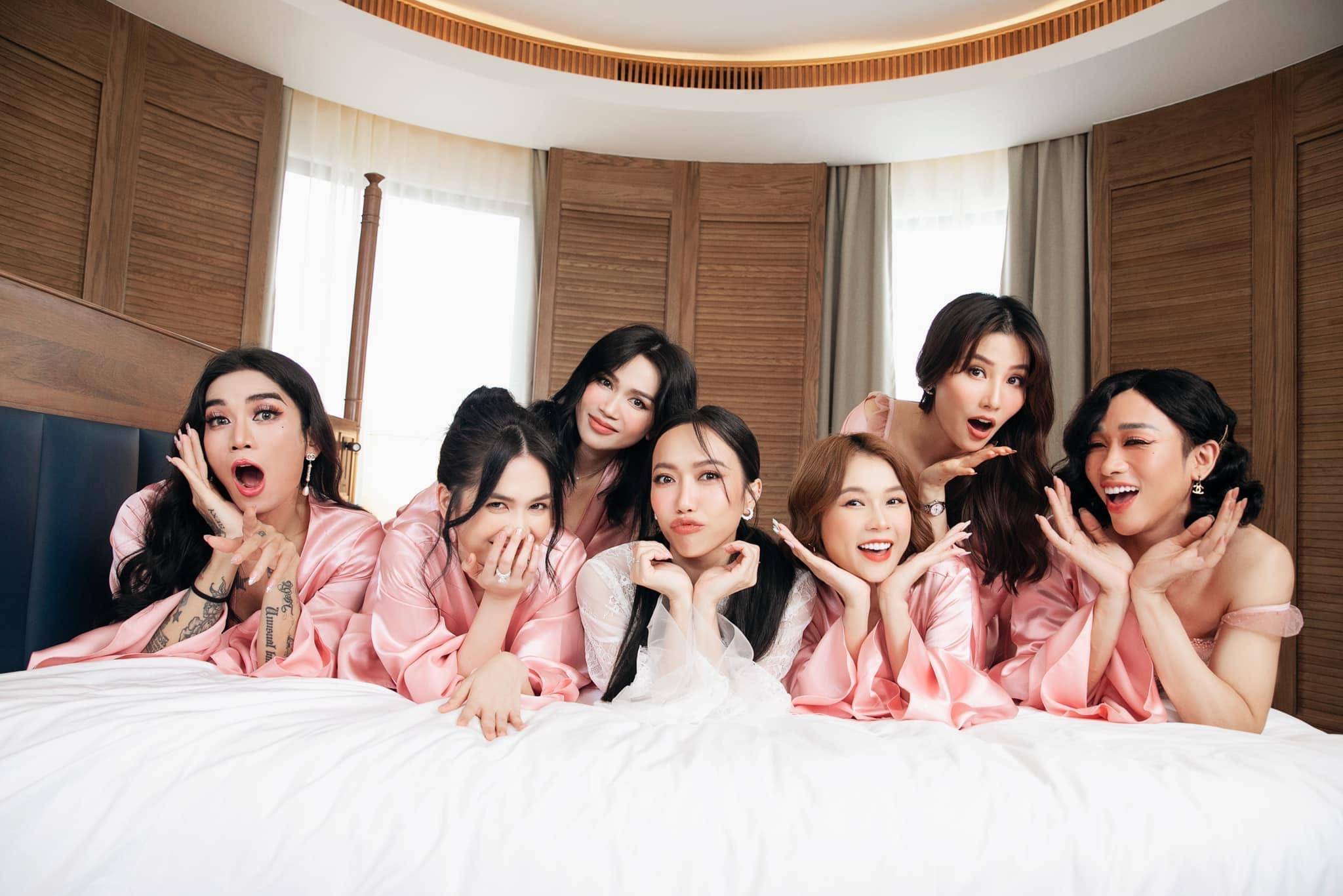 Dàn phù dâu quy tụ toàn những cái tên đình đám trong showbiz như Ngọc Trinh, Sam, Sĩ Thanh, Diễm My 9x. Và đặc biệt có sự góp mặt của hai người đẹp vô cùng quyến rũ đó là Hải Triều và BB Trần. Nói thật thì tôi phải ghen tị vô cùng trước sắc vóc ngày càng “nuột” và nữ tính của hai nghệ sĩ này. Đến con gái còn không so được là có thật nha quý vị!