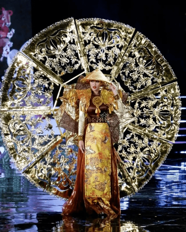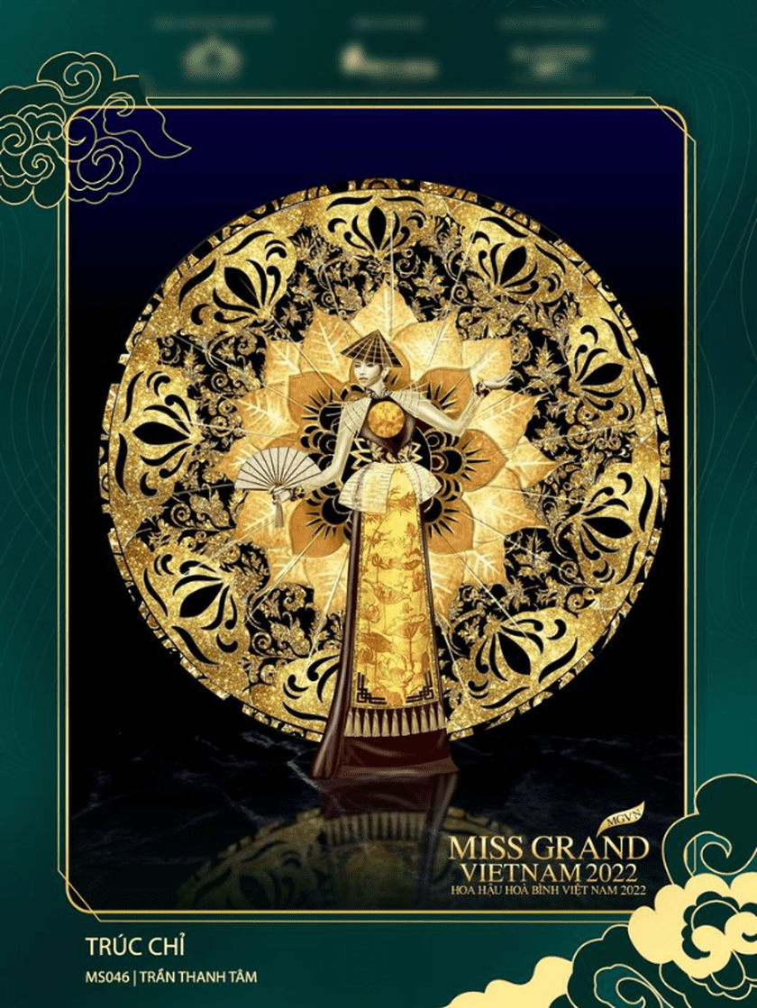 Nổi bật với hiệu ứng bắt mắt và cảm tác từ dòng tranh đặc biệt của Huế, “Trúc chỉ” là một trong những thiết kế gây ấn tượng nhất đêm thi trang phục dân tộc tại Miss Grand International 2022.