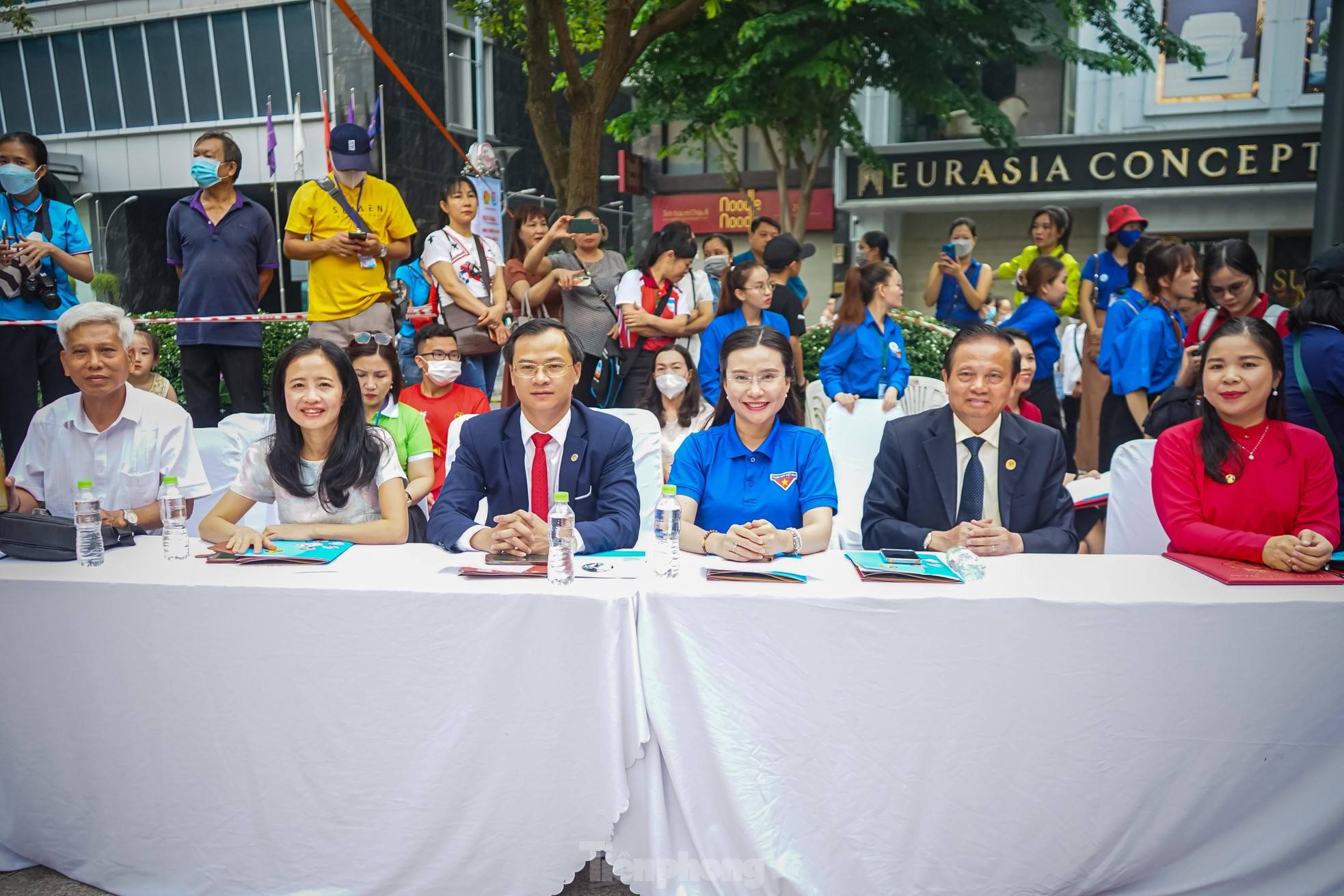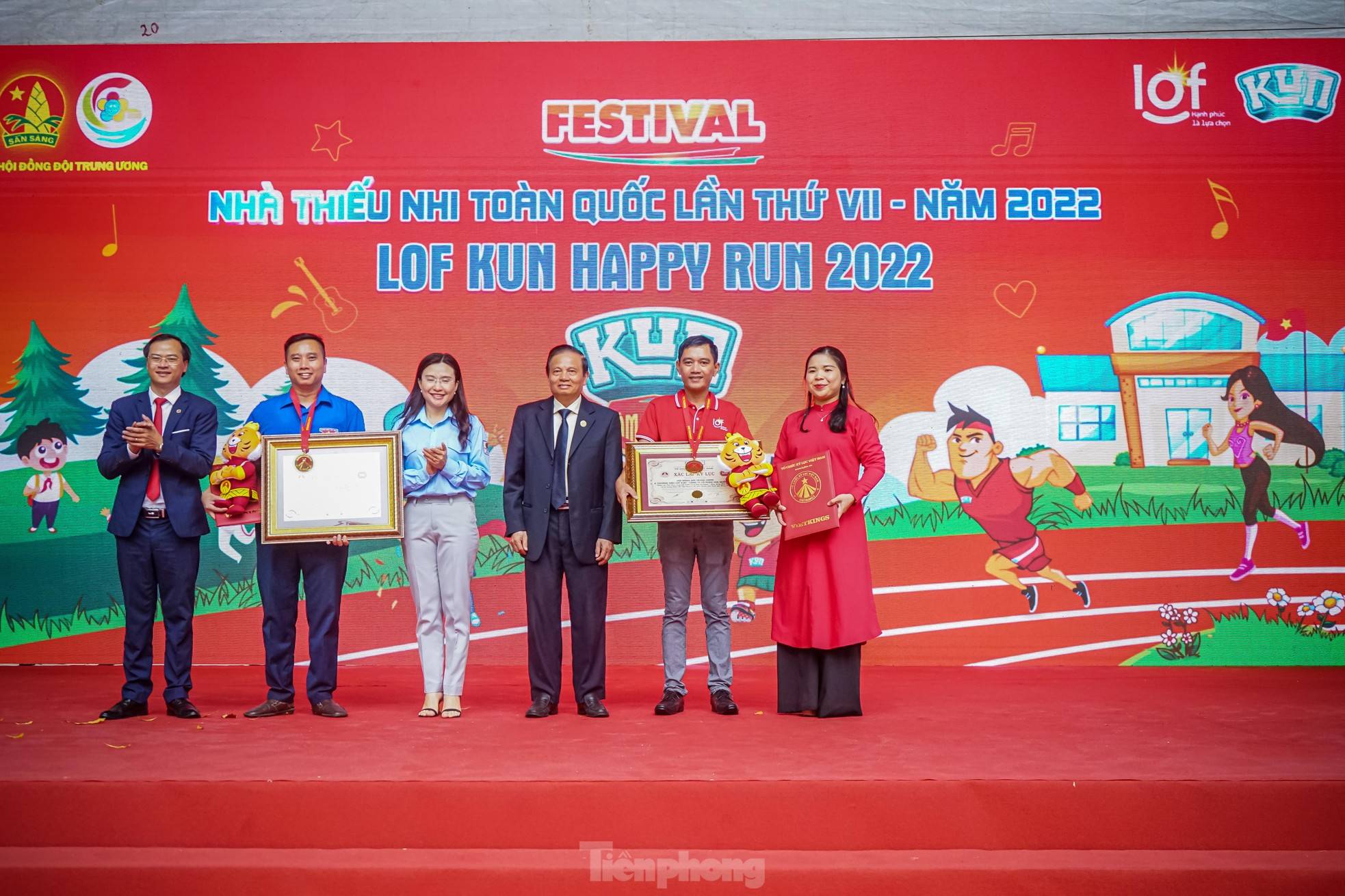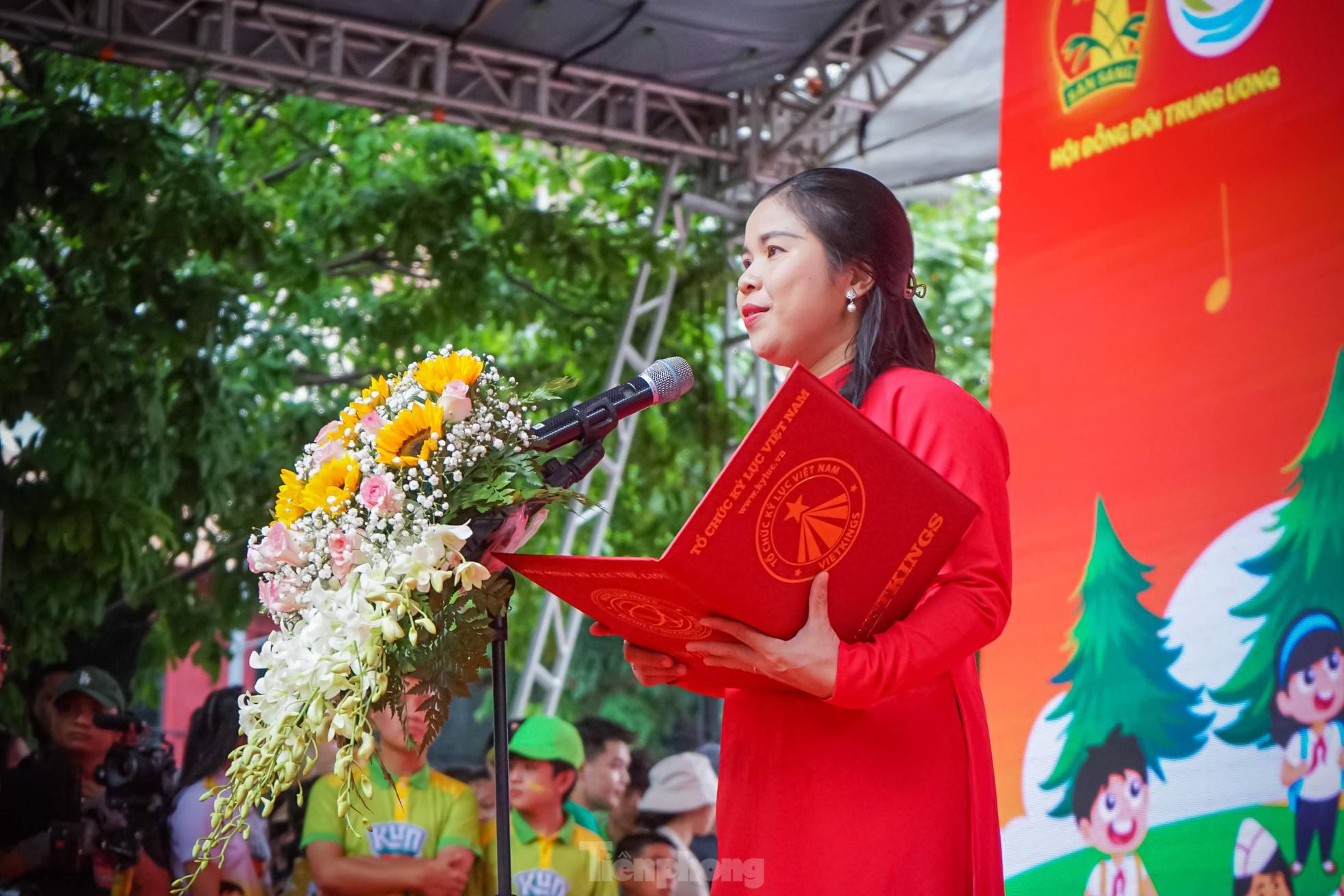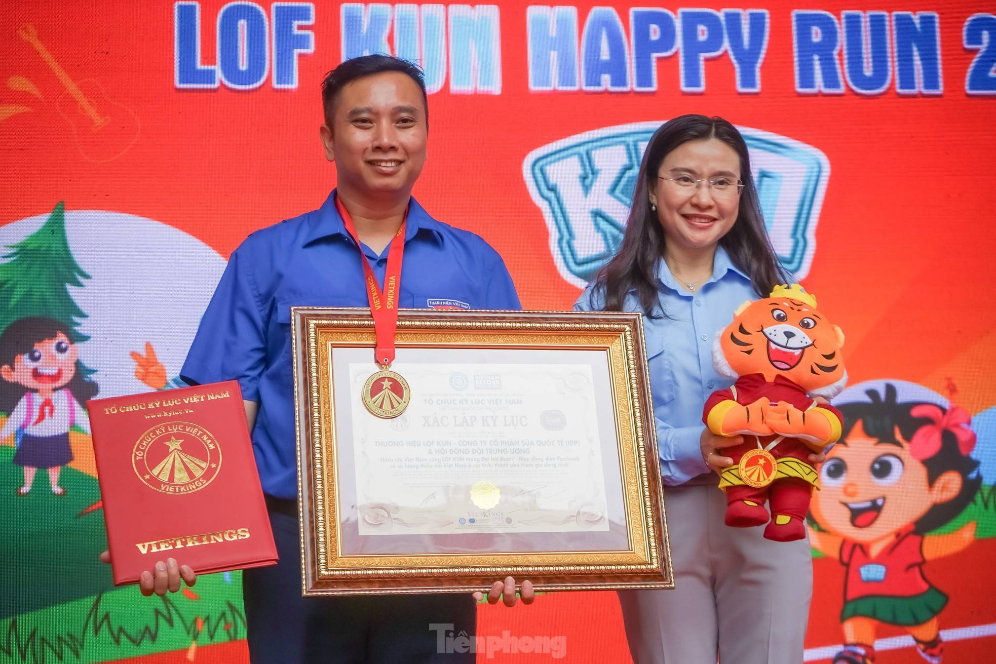 Chị Nguyễn Phạm Duy Trang – Bí thư Trung ương Đoàn, Chủ tịch Hội đồng Đội Trung ương cùng anh Lê Anh Quân – Phó Trưởng Ban Công tác Thiếu nhi Trung ương Đoàn, Phó Chủ tịch Hội đồng Đội Trung ương thay mặt 3.000 thiếu nhi nhận bằng xác lập kỷ lục
