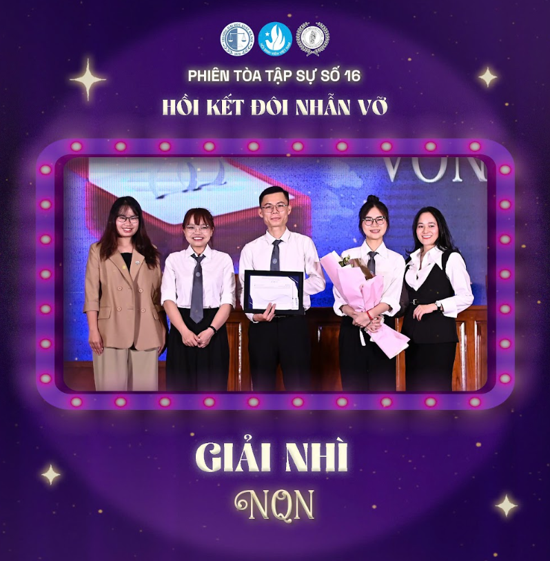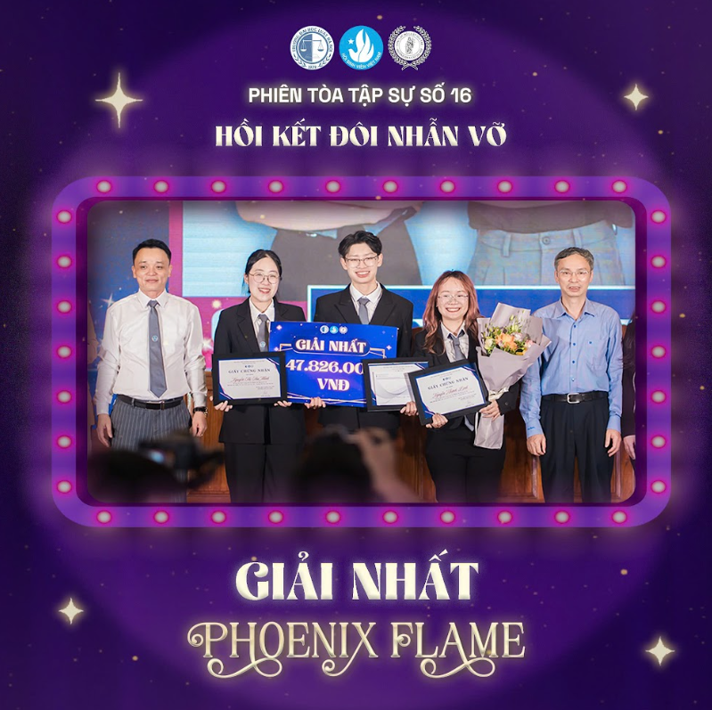 Vào tối ngày 9/5/2025, chung kết cuộc thi “Phiên tòa tập sự số 16: Hồi kết đôi nhẫn vỡ” đã diễn ra vô cùng kịch tính và sôi động tại Trường Đại học Luật Hà Nội giữa hai đội thi “Phoenix Flame” và “NQN”. Đây là sự kiện thường niên và mang đậm dấu ấn riêng biệt của CLB Luật Gia Trẻ thuộc Trường Đại học Luật Hà Nội, với 15 năm tổ chức thành công.