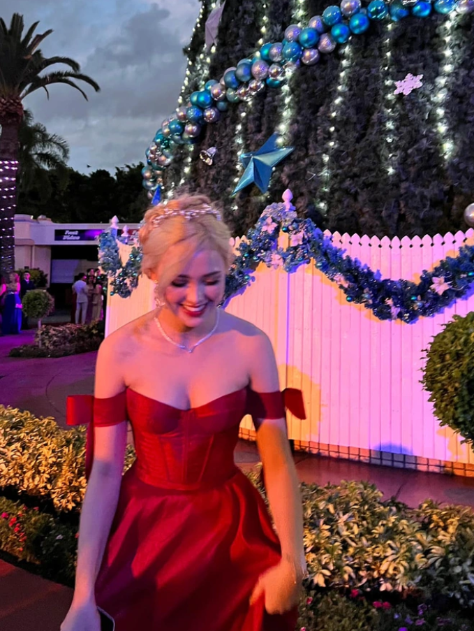 Hồ Ngọc Trang tham dự buổi dạ vũ của trường THPT trong bộ đầm đỏ lộng lẫy.