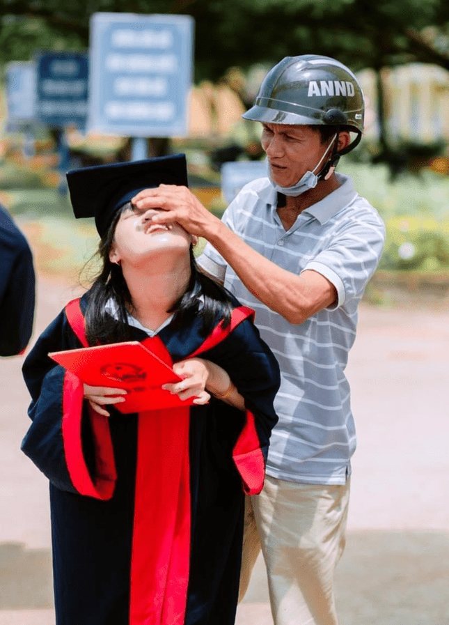 Hình ảnh nữ sinh hồn nhiên được bố chỉnh mũ trong ngày chụp kỷ yếu tốt nghiệp bất ngờ gây sốt mạng bởi khoảnh khắc ý nghĩa nhân Ngày của cha 19/6.