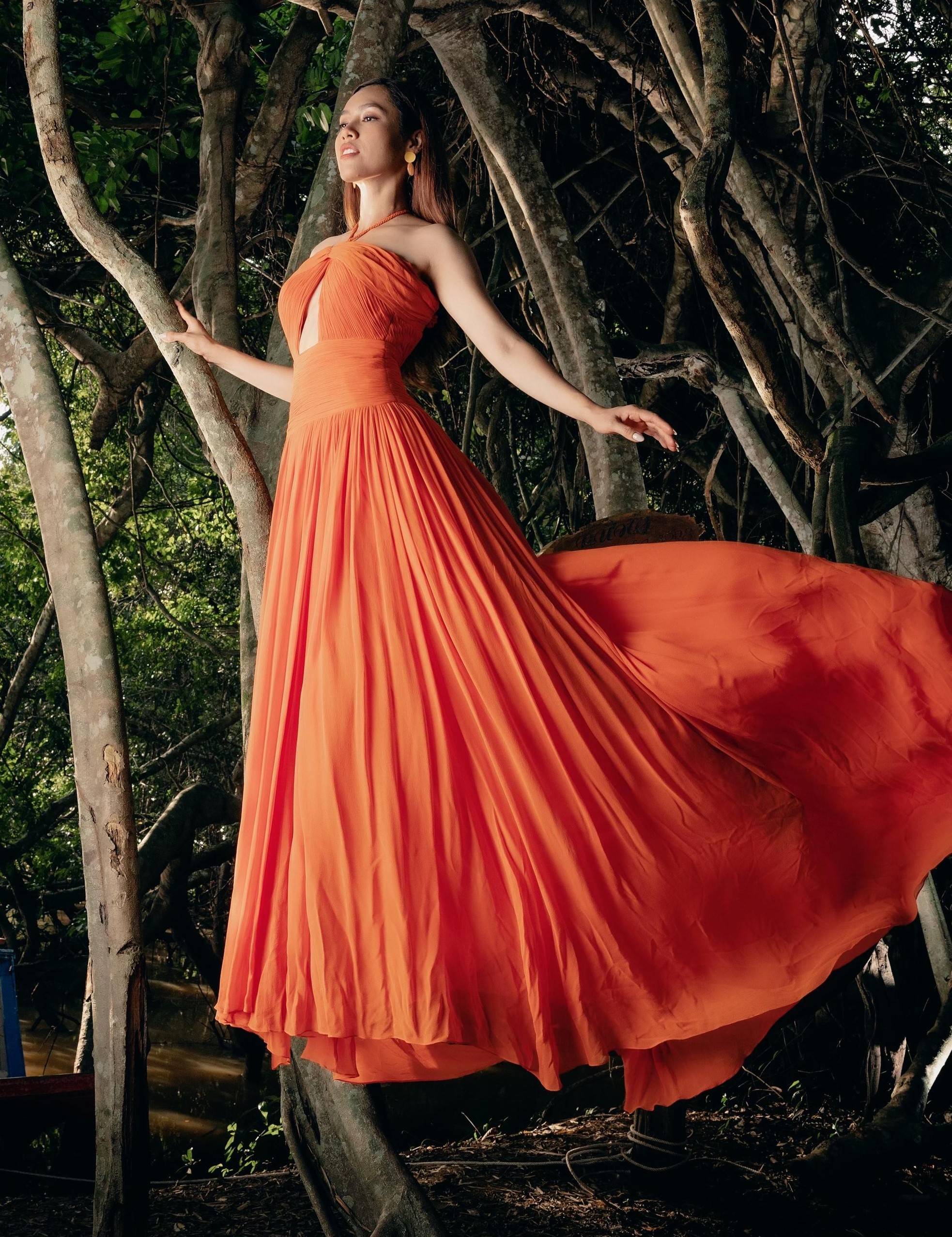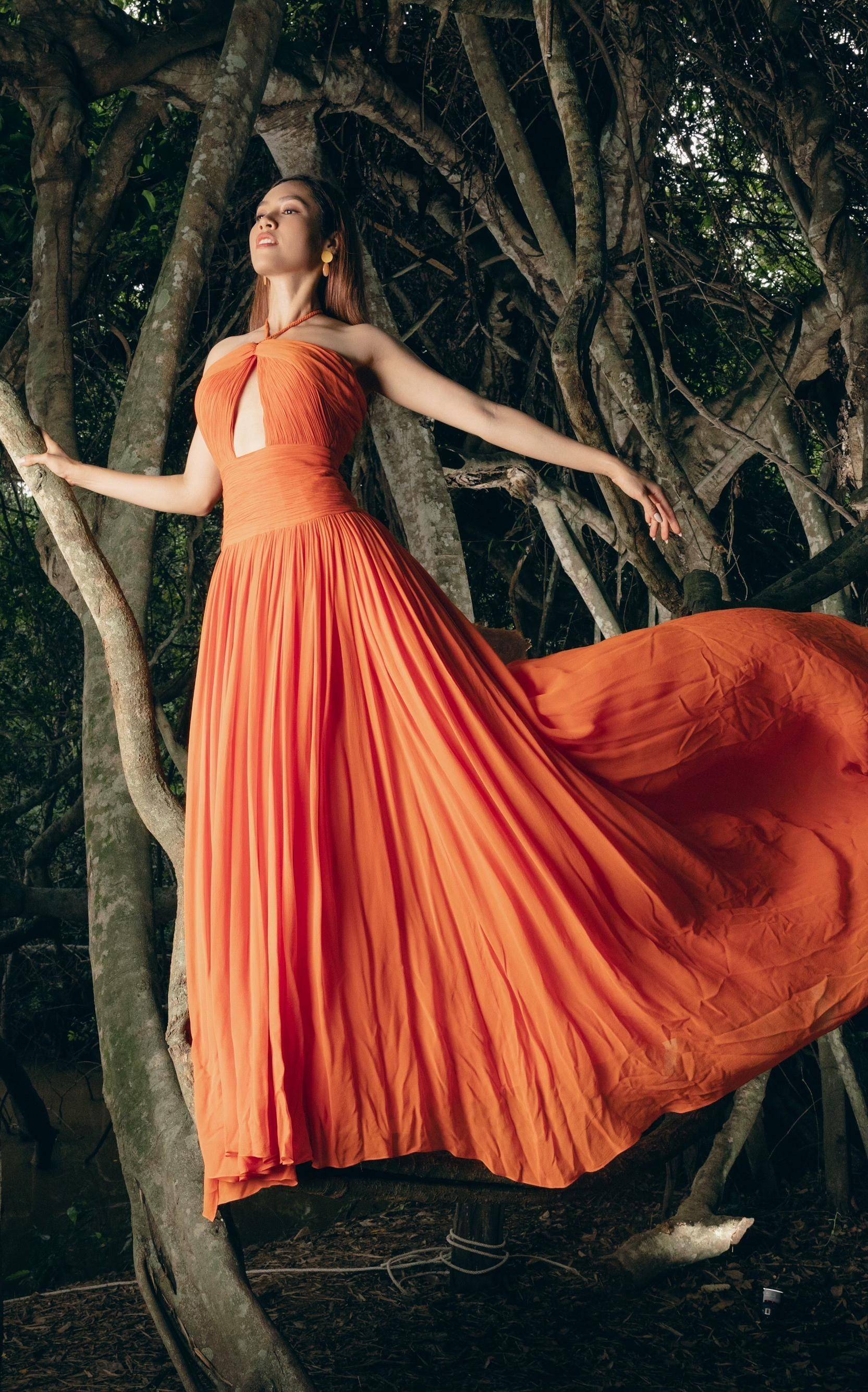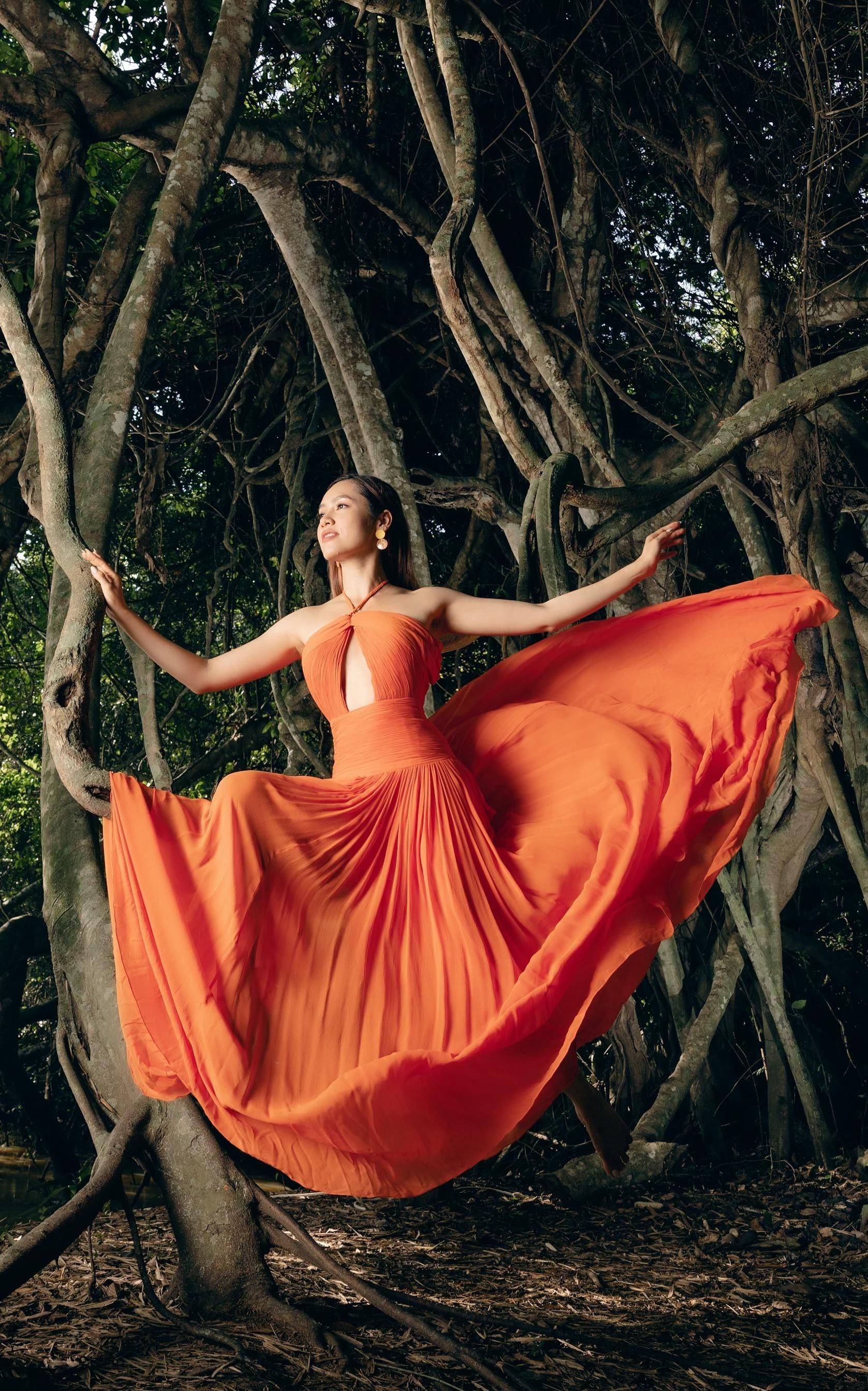 Bộ váy tông màu cam nổi bật với phần tùng váy xoè bay bổng mang lại cho Á hậu Việt Nam 2010 vẻ đẹp 'thoát tục' tựa như một nàng tiên nữ đang hoà mình vào thiên nhiên.