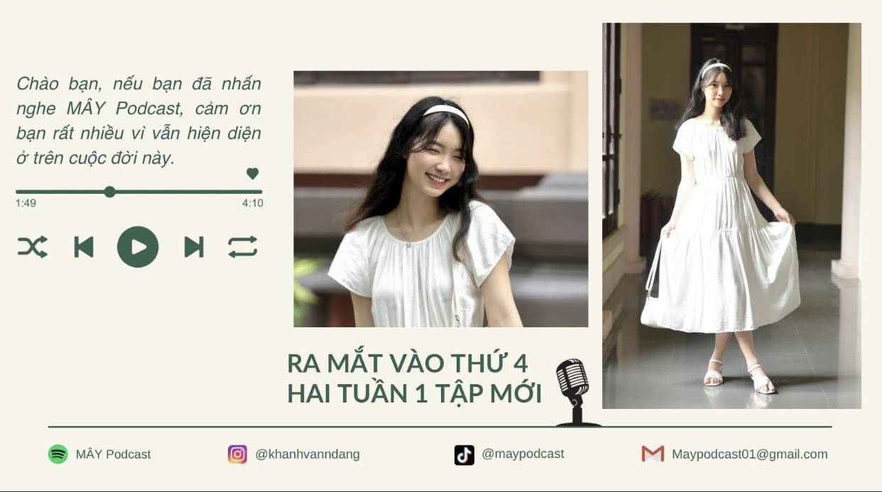Mây, tên thật là Đặng Khánh Vân, được biết đến với vai trò là một podcaster, chủ kênh của Mây Podcast. Cô nàng sinh năm 2001 xây dựng kênh hướng đến đối tượng thính giả trẻ, nơi mà họ tìm thấy sự “chữa lành”.