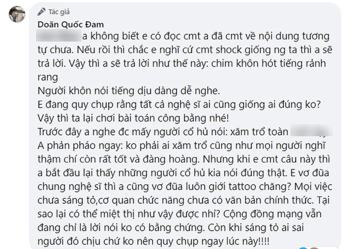 Em đang quy chụp rằng tất cả nghệ sĩ ai cũng giống ai đúng không? Vậy thì ta lại chơi bài toán công bằng nhé! Trước đây anh nghe được mấy người cổ hủ nói: xăm trổ toàn ***. Anh phản pháo ngay, không phải ai xăm trổ cũng như mọi người nghĩ thậm chí còn rất tốt và đàng hoàng. Nhưng khi em bình luận câu này thì anh bắt đầu lại thấy những người cổ hủ kia nói đúng thật. Em vơ đũa chung nghệ sĩ thì anh cũng vơ đũa luôn giới tattoo chăng? Mọi việc chưa sáng tỏ, cơ quan chức năng chưa có văn bản chính thức. Tại sao lại có thể miệt thị như vậy được nhỉ? Cộng đồng mạng vẫn đang chỉ là lời nói không có bằng chứng. Còn khi sáng tỏ ai sai người đó chịu chứ ko nên quy chụp ngay lúc này".