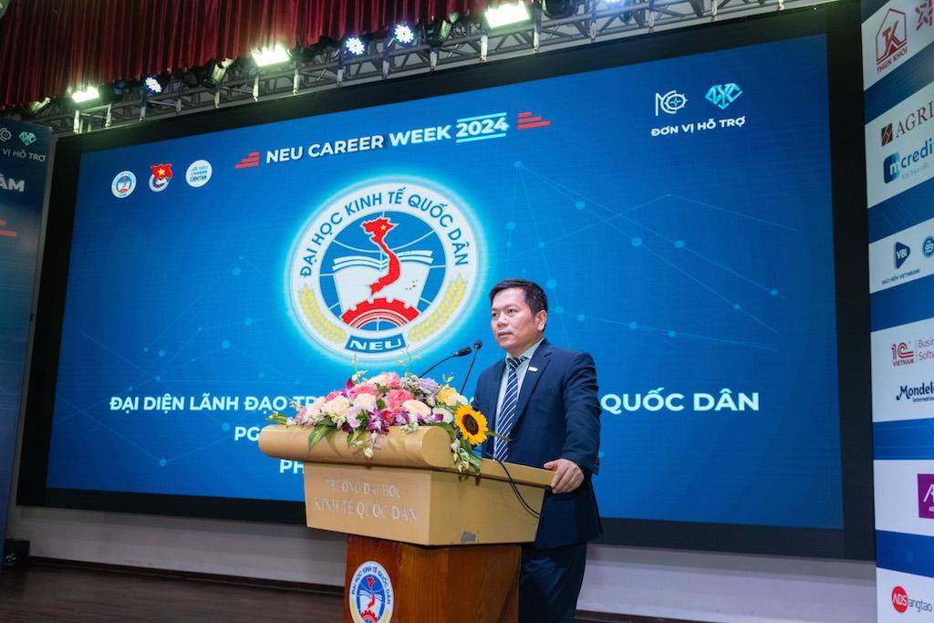 Đại diện lãnh đạo nhà trường phát biểu khai mạc chương trình, PGS.TS Nguyễn Thành Hiếu - Phó Hiệu trưởng nhà trường nhấn mạnh “Tuần nghề nghiệp và việc làm - NEU Career Week 2024” không chỉ mong muốn đưa cơ hội làm việc đến gần với sinh viên hơn mà còn mong muốn thấu hiểu nhu cầu của các doanh nghiệp, từ đó cải thiện chương trình học của trường sát với nhu cầu của xã hội. Đồng thời, PGS.TS Nguyễn Thành Hiếu cũng bày tỏ lòng biết ơn chân thành tới các doanh nghiệp và mong muốn sẽ tiếp tục phối hợp sát sao trong thời gian tới.