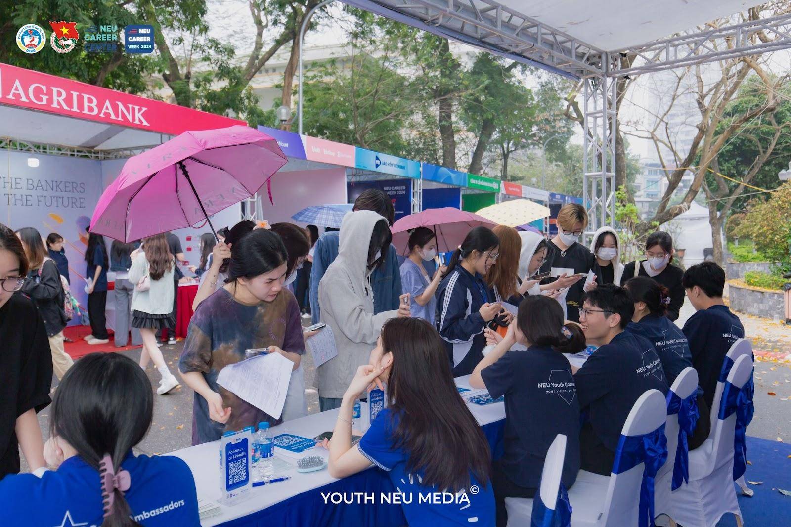 Đến với NEU Career Week 2024, nổi bật là hoạt động tư vấn và tuyển dụng trực tiếp tại các gian trại doanh nghiệp trong khuôn viên trường. Chương trình năm nay đã thu hút hàng nghìn sinh viên đến với gần 40 gian trại của các doanh nghiệp đa ngành nghề, đa lĩnh vực như MB Bank, Sacombank,... (thuộc lĩnh vực ngân hàng); PVI, Manulife,... (thuộc lĩnh vực bảo hiểm); One Mount, Gear inc, VNG... (thuộc lĩnh vực công nghệ); Ahamove, TH Food, Aeon,... (thuộc khối ngành dịch vụ),... Mỗi gian trại lại mang đến cho sinh viên những hoạt động thú vị cùng nhiều cơ hội việc làm đa dạng.