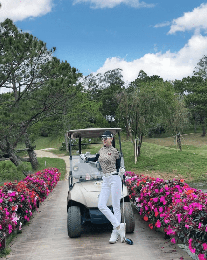 Không chỉ có shark Bình, Phương Oanh cũng đăng tải bức ảnh vô cùng xinh đẹp khi đứng check-in ở sân golf. Cô nàng mặc chiếc áo golf dài tay kết hợp với quần trắng có kèm dây lưng diện đồ đôi với shark Bình vào hào hứng viết: “Thấy bảo đây là sân Golf đầu tiên tại Việt Nam”. Tôi thấy giữa bão dư luận nhưng nữ diễn viên này vẫn rất lạc quan, bỏ ngoài tai những bình luận của anti fan.