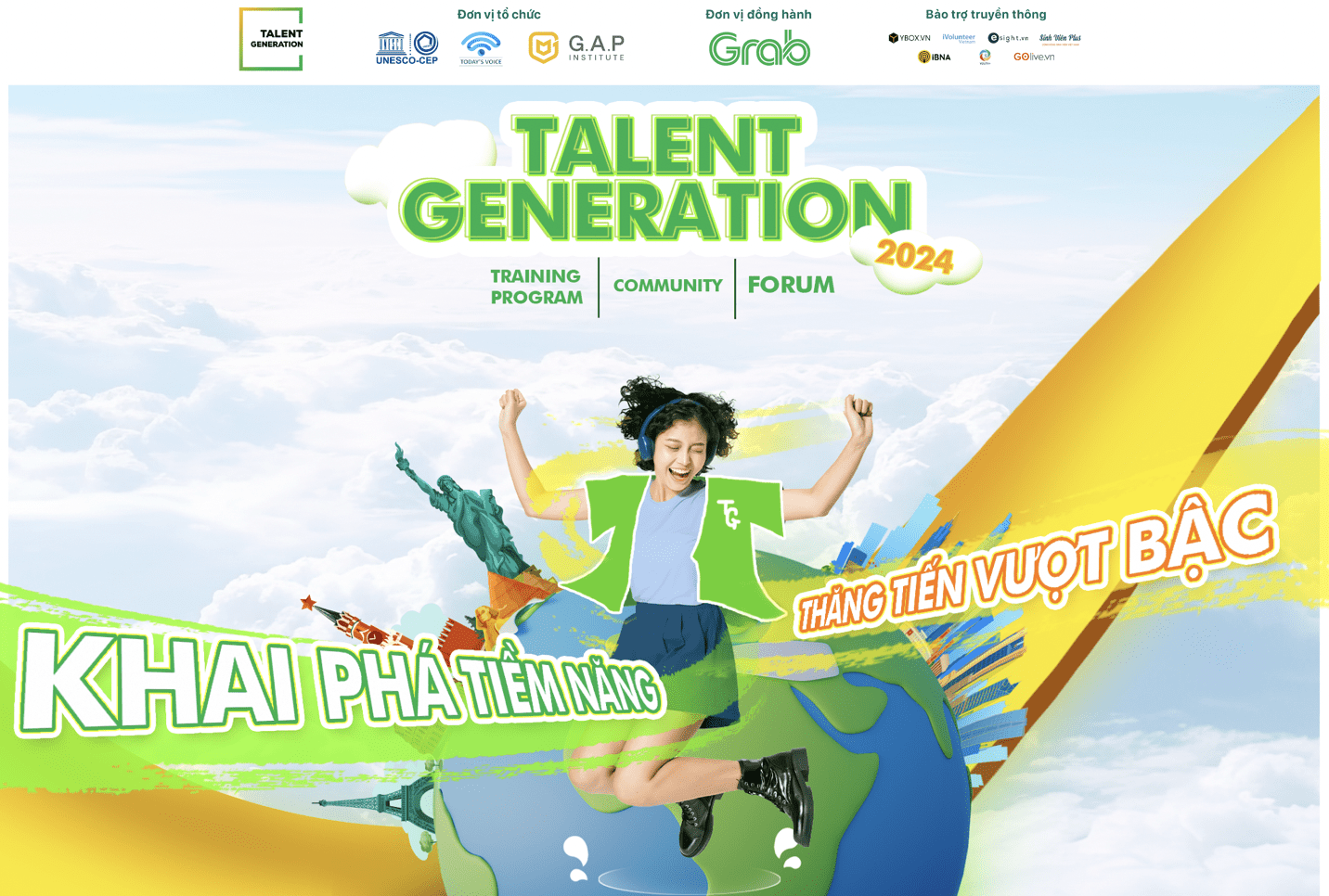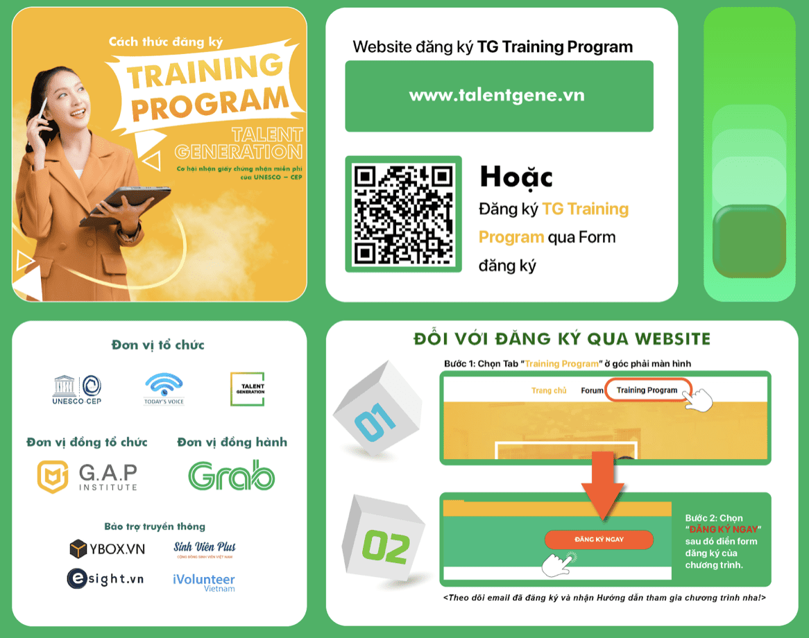 Talent Generation Training Program: Chương trình trao học bổng học tập kỹ năng miễn phí (trị giá 2 triệu đồng/ suất học bổng) và có cấp chứng nhận của UNESCO-CEP với 4 kỹ năng học tập và làm việc quan trọng 4Cs: Critical Thinking, Creativity, Communication, Collaboration.
