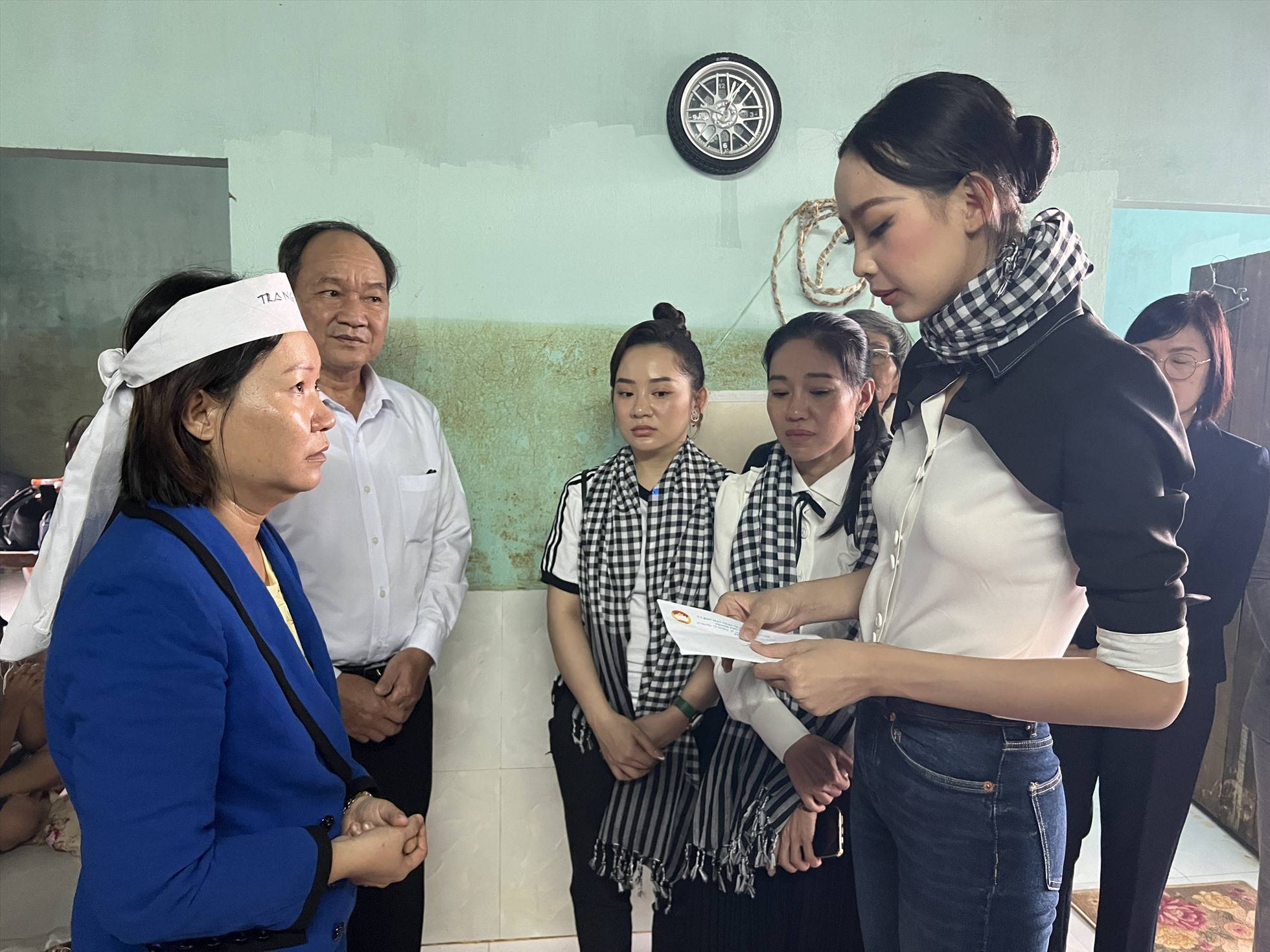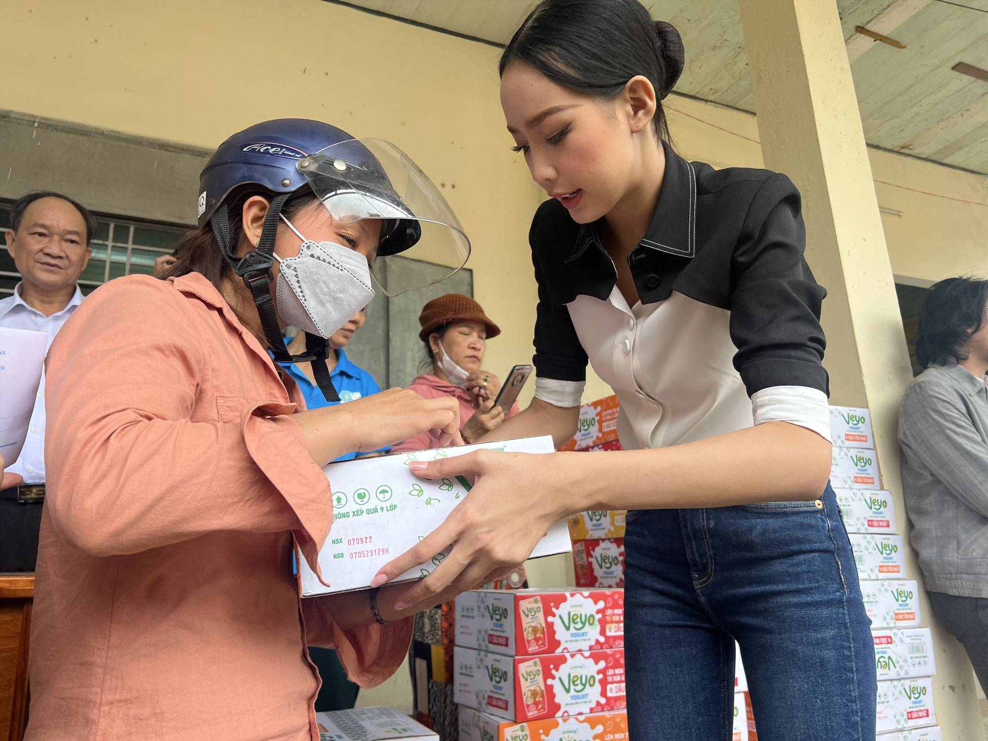 Tuy nhiên sau đó nàng hậu chỉ diện áo sơ mi và quần jeans giản dị, lịch sự trực tiếp đi giúp đỡ đồng bào miền Trung. Hoa hậu lội nước đến từng gia đình có hoàn cảnh đáng thương, bị thiệt hại nặng nề sau trận bão lịch sử để chia sẻ, gửi lời động viên và trao tặng những món quà thiết thực hỗ trợ bà con nơi đây.