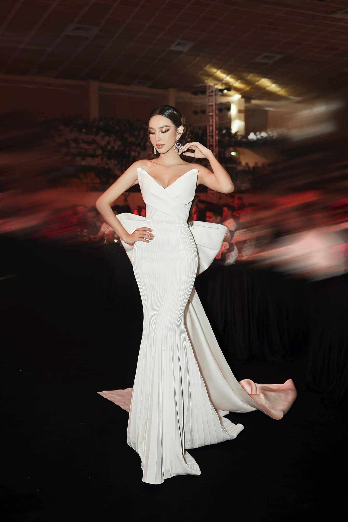 Mới đây nhất, nàng hậu tiếp tục tạo được điểm nhấn mới mẻ khi xuất hiện ở một chương trình với bộ váy đuôi cá màu trắng cầu kỳ, lộng lẫy.